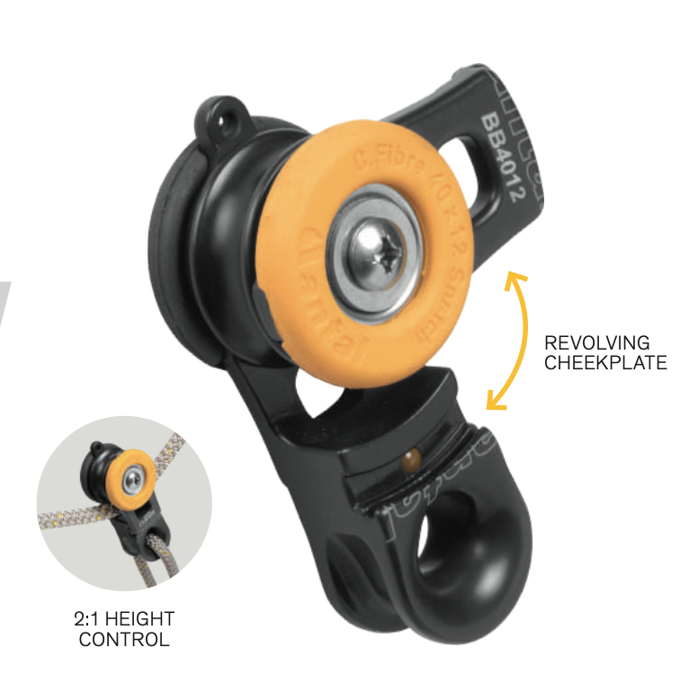 The new Antal Barber Block is a snatch block with a ring head, it provides an immediate entry of the sheet (the cheekplate revolves around the sheave axle allowing the block to open) and an easy 2:1 control (a line through the ring allows the control of the block height). A safety ball prevents the revolving from accidental opening and an adjustable screw can set the ball in fully locked position.