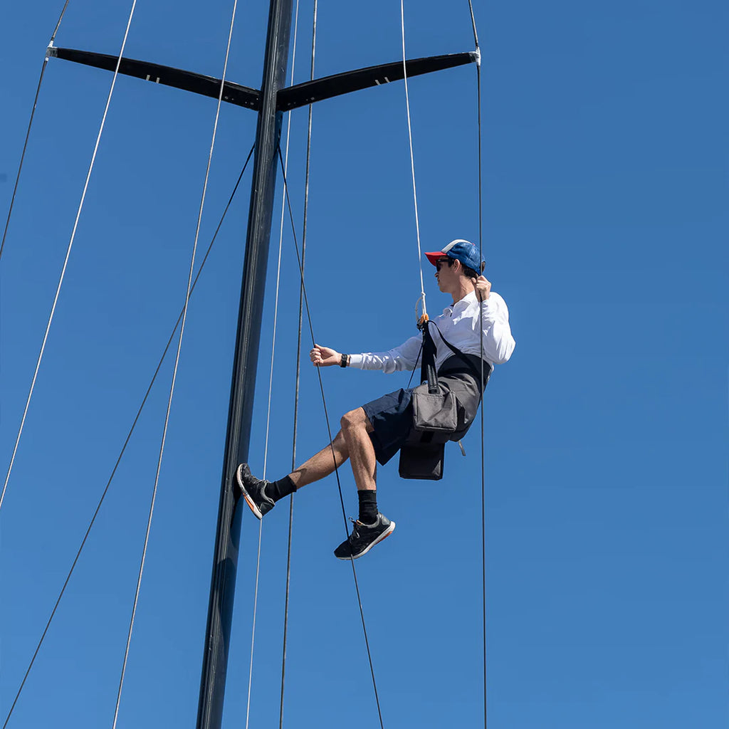 Using high-strength, double-layer 48mm lifting strap with two reinforced loops for halyard attachment, the padded seat and lower back support with integral crotch strap and adjustable waist belt provides comfort and security even when aloft for long periods of time. Two handy, wide-mouth utility pouches with webbing loops for tool lanyards provide the necessary storage to allow hands free working and control. The addition of a down haul/lazy guy attachment point allows for chair to be secured to reduce swing while aloft as well has helping control the descent.